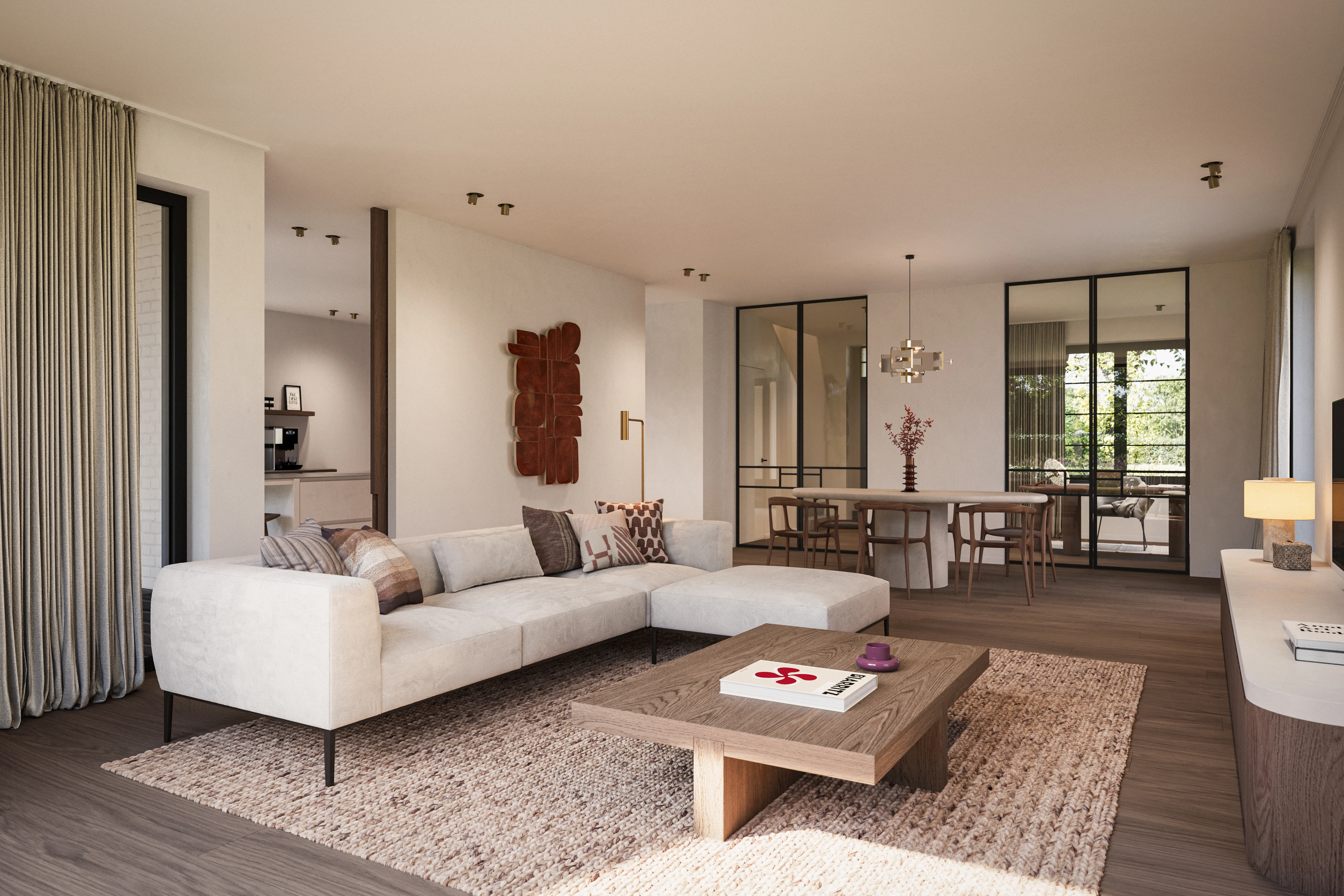 De zonovergoten en uitnodigende leefruimte vormt het hart van de woning. Dankzij het doordachte plan biedt elke ruimte rust, licht en